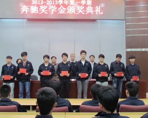 中国教育品牌网讯 2013年5月9日下午,2012至2013学年度第一学期奔驰奖学金颁奖典礼在汽车工程学院报告厅隆重举行。汽车工程学院副院长王霆、北京奔驰人员发展科高级经理威兰先生和工程师贾欣等领导参加了颁奖典礼。
